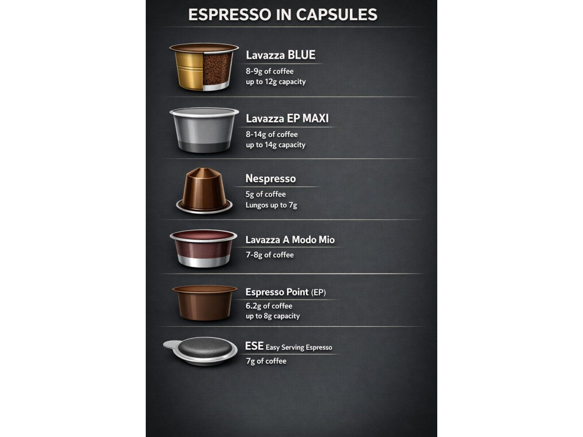 It’s worth noting that our reference point is Italian-style espresso, which is typically made by forcing very hot water under high pressure (9 bar) through finely ground, compacted coffee. The coffee systems included in this first infographic are: Lavazza BLUE, a professional system by Lavazza; Espresso Point MAXI; Nespresso; Lavazza A Modo Mio; Lavazza Espresso Point; and ESE.